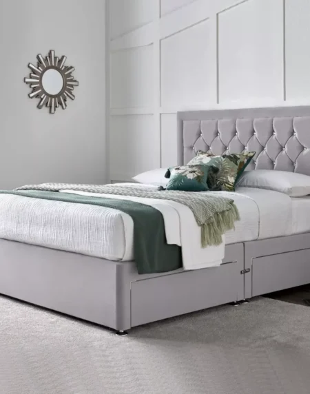 Features of Crushed Velvet Divan Bed Customize option available with Divan bed Tufted details on Headboard Base sides made up of high-quality chipboard Storage options available with this base type 2 drawers, 4 drawers option Add or remove parts according to your budget and preferences Crushed Velvet upholstery adds a
