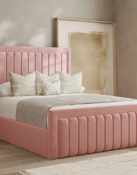 Princess Blush Bed Frame The Princess Blush Bed Frame is a charming blend of feminine elegance and bold structure. Upholstered in a soft blush pink velvet, its standout feature lies in the fluted vertical panels and thick padded border, giving it a regal and tailored look. The coordinated footboard mirrors the