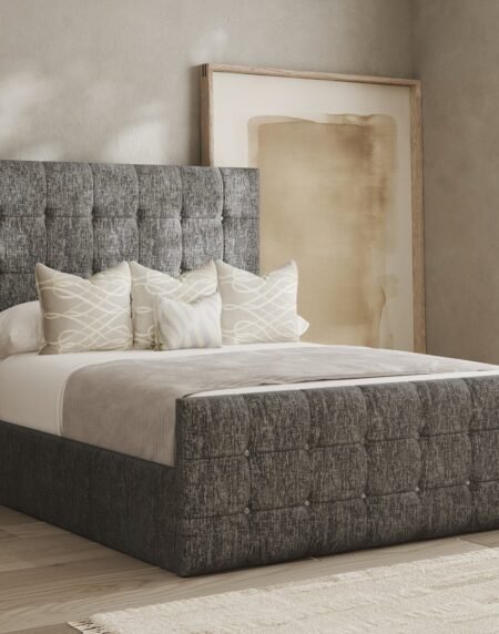 Cubo Chenille Bed Frame The Cubo Chenille Bed Frame is where classic button-tufted design meets bold, modern structure. Upholstered in a richly textured charcoal chenille, this bed features deep-set square tufting across both the headboard and footboard for a symmetrical, quilted look. The soft yet durable fabric adds a tactile warmth